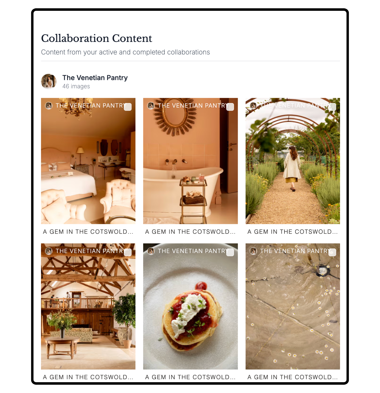 Head to your content bank to find all media that your space has been tagged in. Download up to 5 images per collaboration with automatic licensing to use across your own socials.